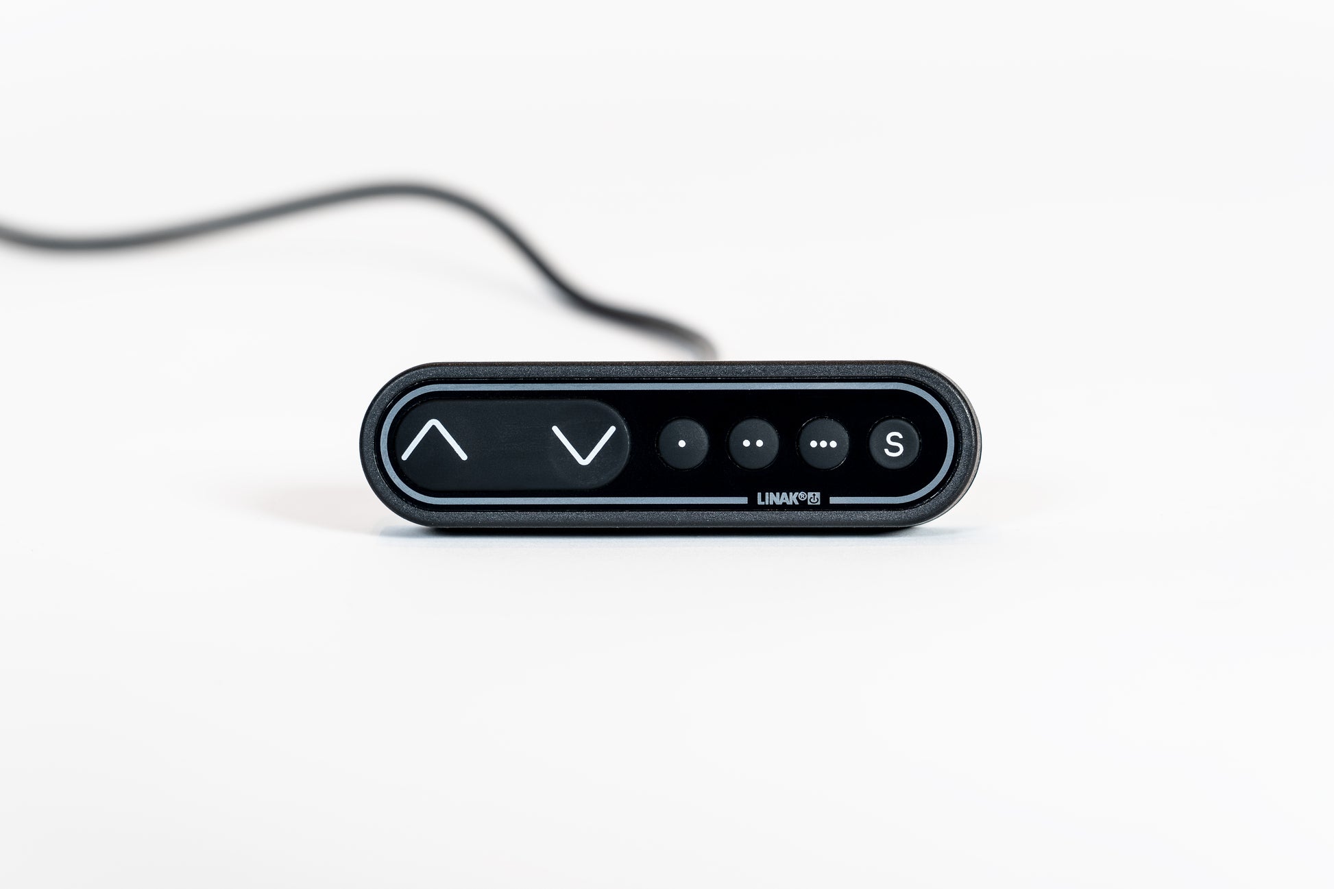 LIFT's wired controller provides useful and ergonomic functionality in all situations. It can be placed on a surface or mounted to the underside of a desk with the provided bracket. The controller provides up/down adjustment and can store and recall three user-defined height positions.
