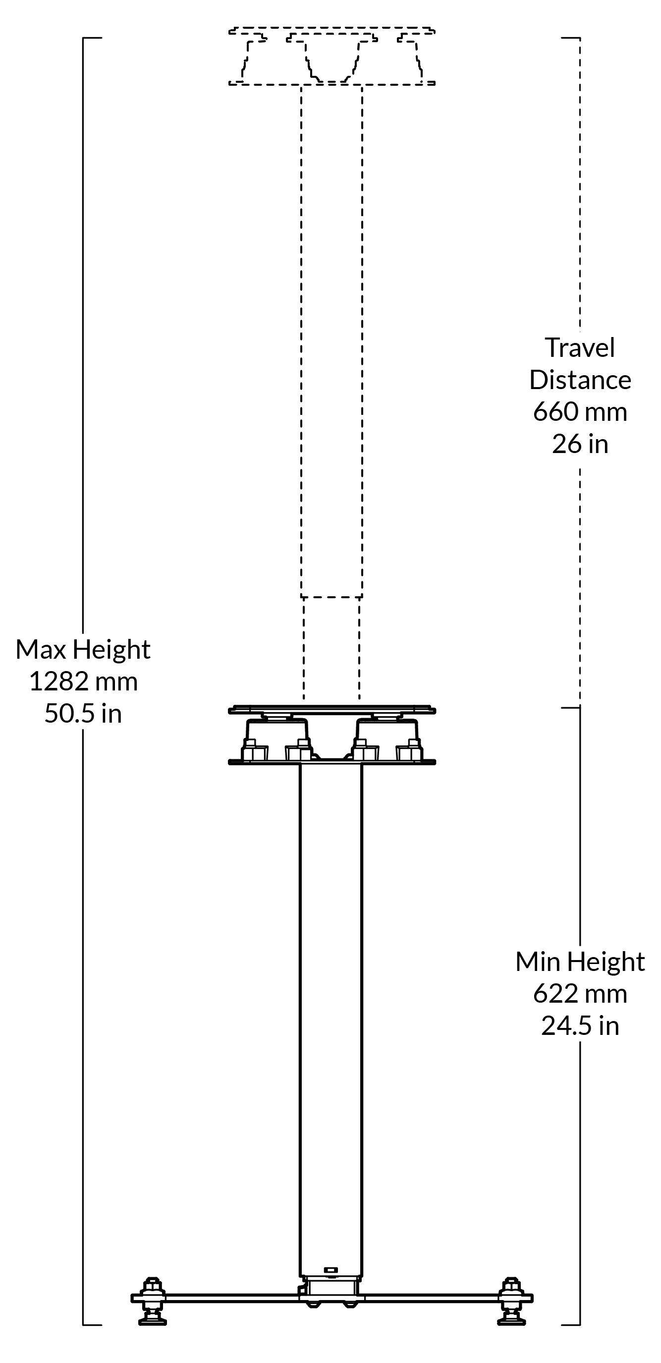 LIFT Mk2 was designed with ease of adjustability in mind. Its motorized lifting column provides a wide range of height adjustment. LIFT Mk2's low-profile x-shaped baseplate fits discretely around racks, desks and desk legs. Our precision leveling feet provide quick top-down adjustment and a stability on all types of flooring.